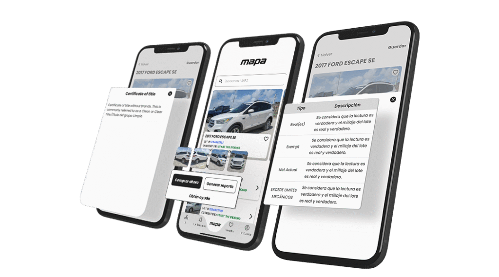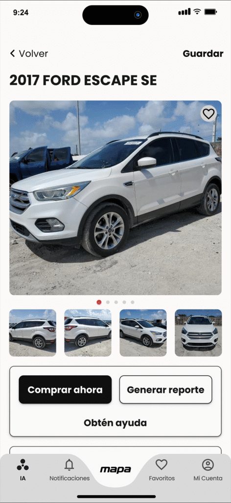 Podrás conocer toda la información del auto: fotos, VIN, tipo de título, locación, oferta actual, etc. Además, tendrás la opción de generar un reporte completo del mismo.