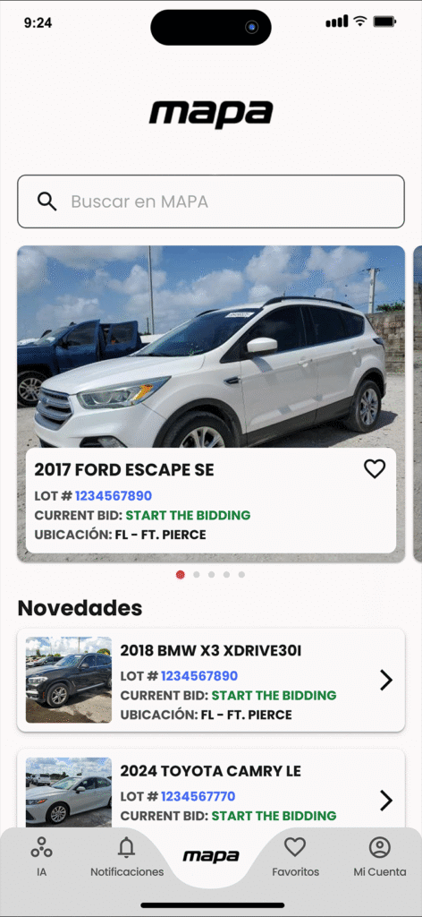 Cada vehículo incluye un reporte con millas reales, tipo de título, condiciones, ubicación y fecha de subasta. Con alertas y recomendaciones personalizadas, sabrás exactamente qué estás comprando antes de ofertar y podrás tomar decisiones seguras y transparentes.